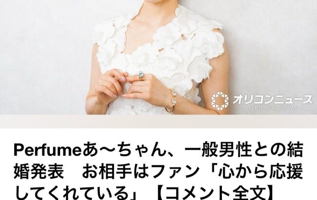 【速報】Perfumeあ~ちゃん、一般男性との結婚発表 お相手はファン「心から応援してくれている」 続きを読む 続きを見る