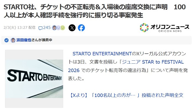 【ジャニヲタ】STARTO社、チケットの不正転売&入場後の座席交換に声明 100人以上が本人確認手続を強行的に振り切る事案発生!! 続きを読む 続きを見る