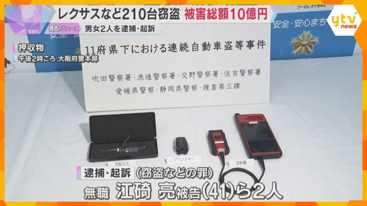 高級車「レクサス」など車210台を窃盗か 男女2人を逮捕・起訴 被害総額10億円 大阪・吹田市 大阪府吹田市で乗用車を盗んだとして男女2人が逮捕・起訴されました。2人はこれまでに高級車を含む210台の車を盗み、事務所荒らしなどをした疑いがもたれていて、被害総額は10億円に及ぶということです。 窃盗などの罪で逮捕・起訴されたのは、住居不定・無職の江碕亮被告(41)ら2人で、去年(2025年)2月 […]