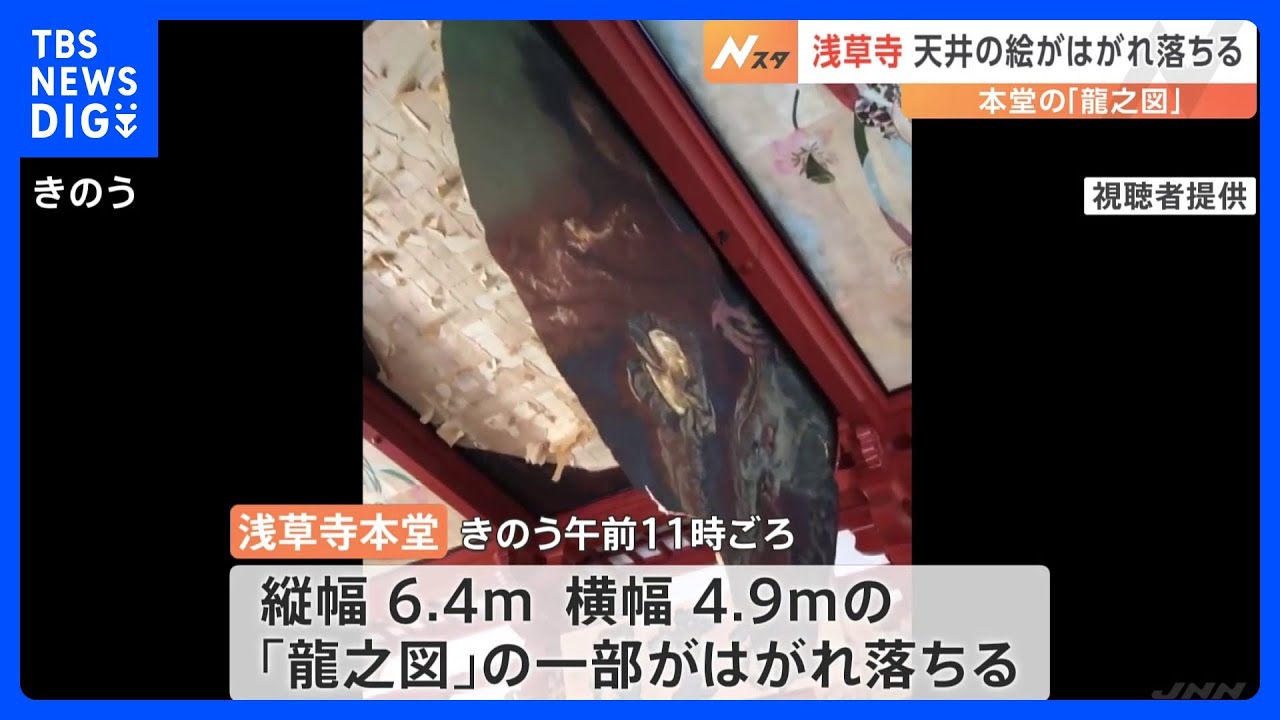 きのう午前11時ごろ、浅草寺本堂の天井に描かれた縦6.4メートル、横4.9メートルの「龍之図」の一部が、突然、はがれ落ちたということです。