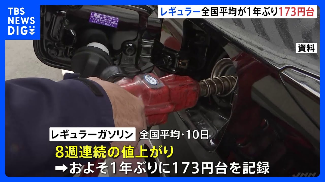 レギュラーガソリン価格 およそ1年ぶり173円台 来週も値上がりの見通し|TBS NEWS DIG