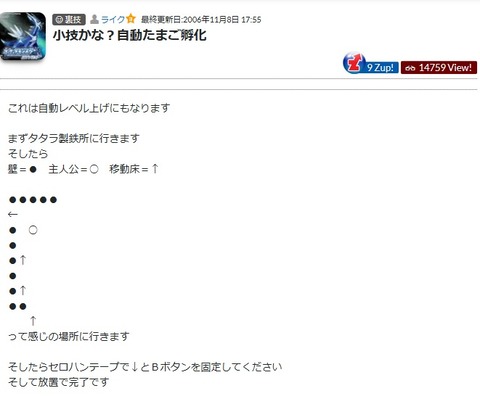 ワザップのポケモンの裏技試してた奴 1: 09/17(火) 02:36:02.451 ワザップ君「小技かな?自動たまご孵化」 これは自動レベル上げにもなります まずタタラ製鉄所に行きます そしたら 壁=● 主人公=○ 移動床=↑ ●●●●● ← ● ○ ● ●↑ ● ●↑ ●● ↑ って感じの場所に行きます そしたらセロハンテープで↓とBボタンを固定してください そして放置で完了です なぜ↓ […]