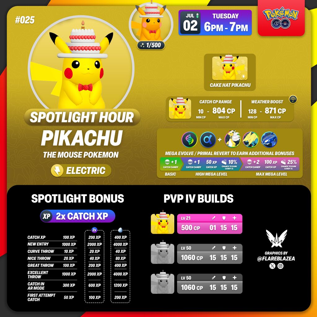 【ポケモンGO】本日の18時から「ケーキ帽子ピカチュウ」が大量発生!捕獲時のXPが2倍!#スポットライトアワー
