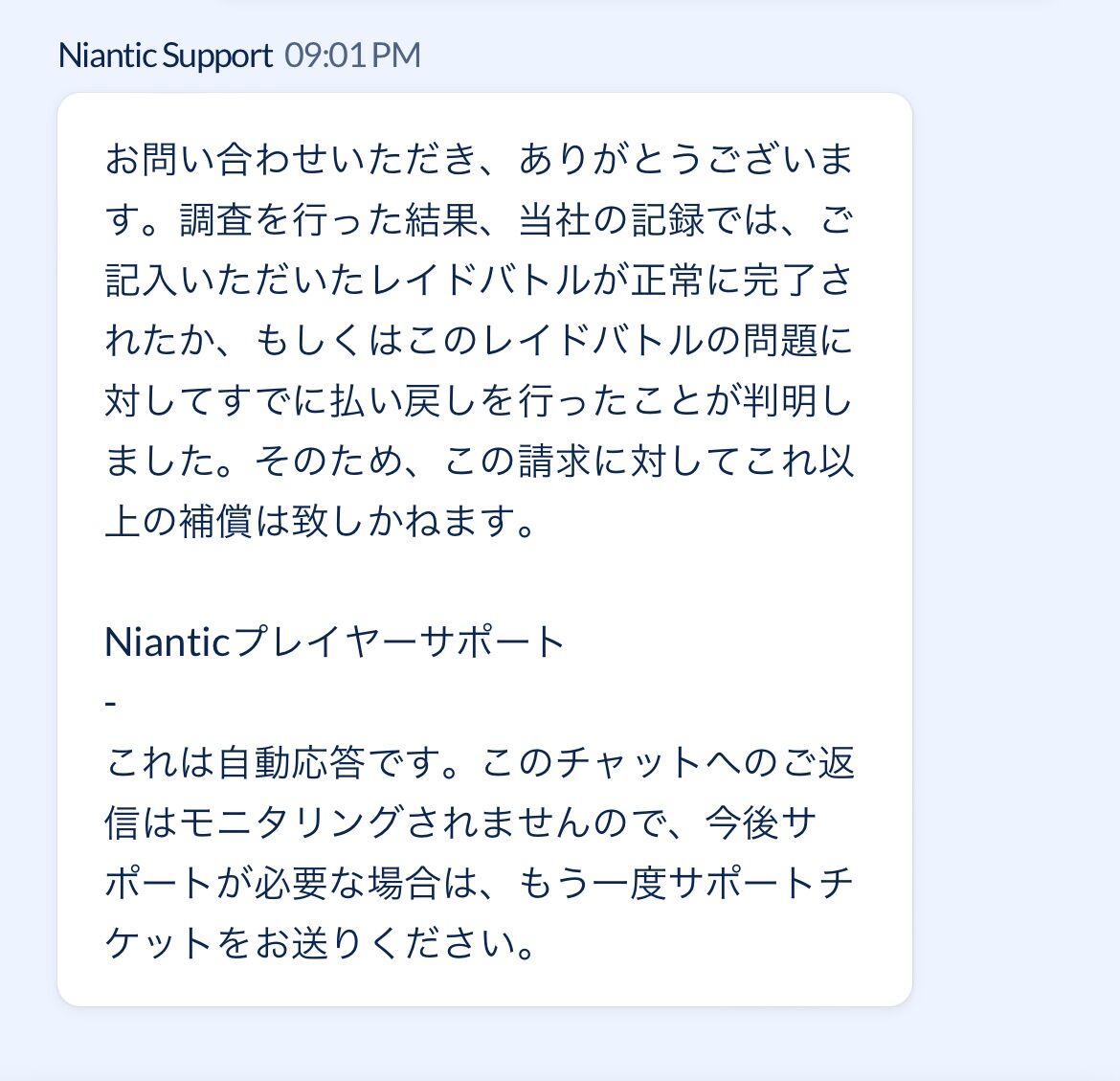 レイドの問題→捕獲チャレンジでボールやきのみが投げられなかった で問い合わせたら「レイドバトルが正常に完了されたか、すでに払い戻しを行ったことが判明した」って言われたんだけどどこに問い合わせたらいい?もちろん払い戻しも受けてない