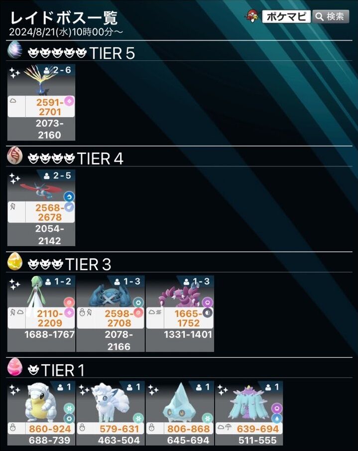 【ポケモンGO】伝説レイド更新による現在のレイドボス一覧