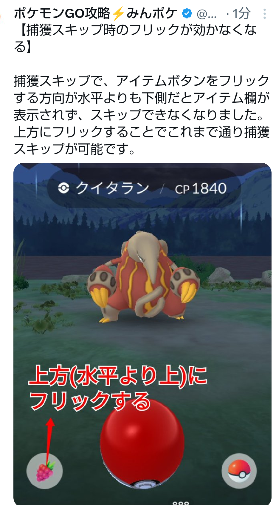 【ポケモンGO】捕獲キャンセル時は継続、アイテムボタンを上方向にフリックで今まで通り可能