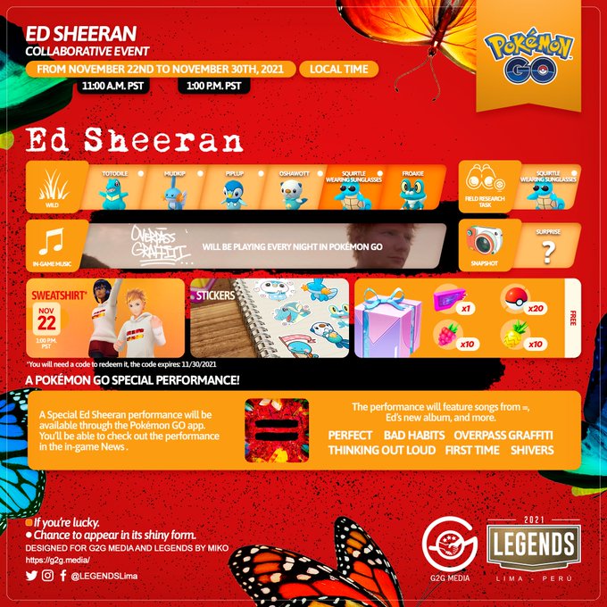 A brand-new collaboration event with #EdSheeran#PokemonGO #G2G #Equals #PokemonGOxEdSheeran pic.twitter.com/vruLU3xWL7— LEGENDS (@LEGENDSLima) November 18, 2021