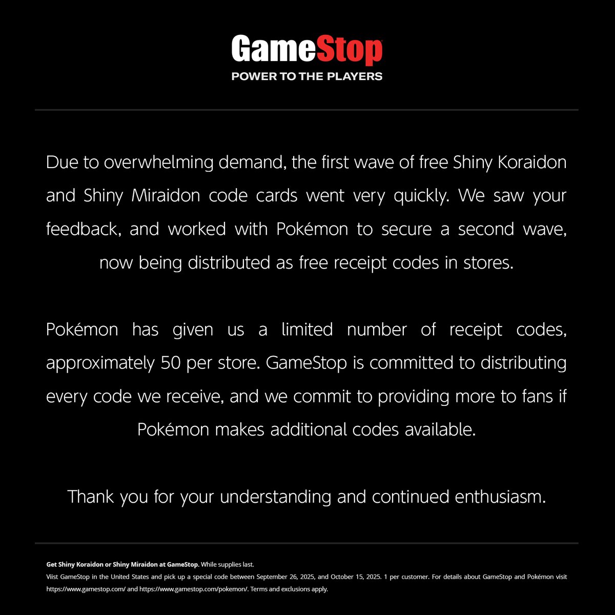 GameStopは受け取ったすべてのコードを配布することをお約束し、もしポケモンが追加コードを提供した場合には、さらに多くのファンの皆さまに配布できるよう努めます。
