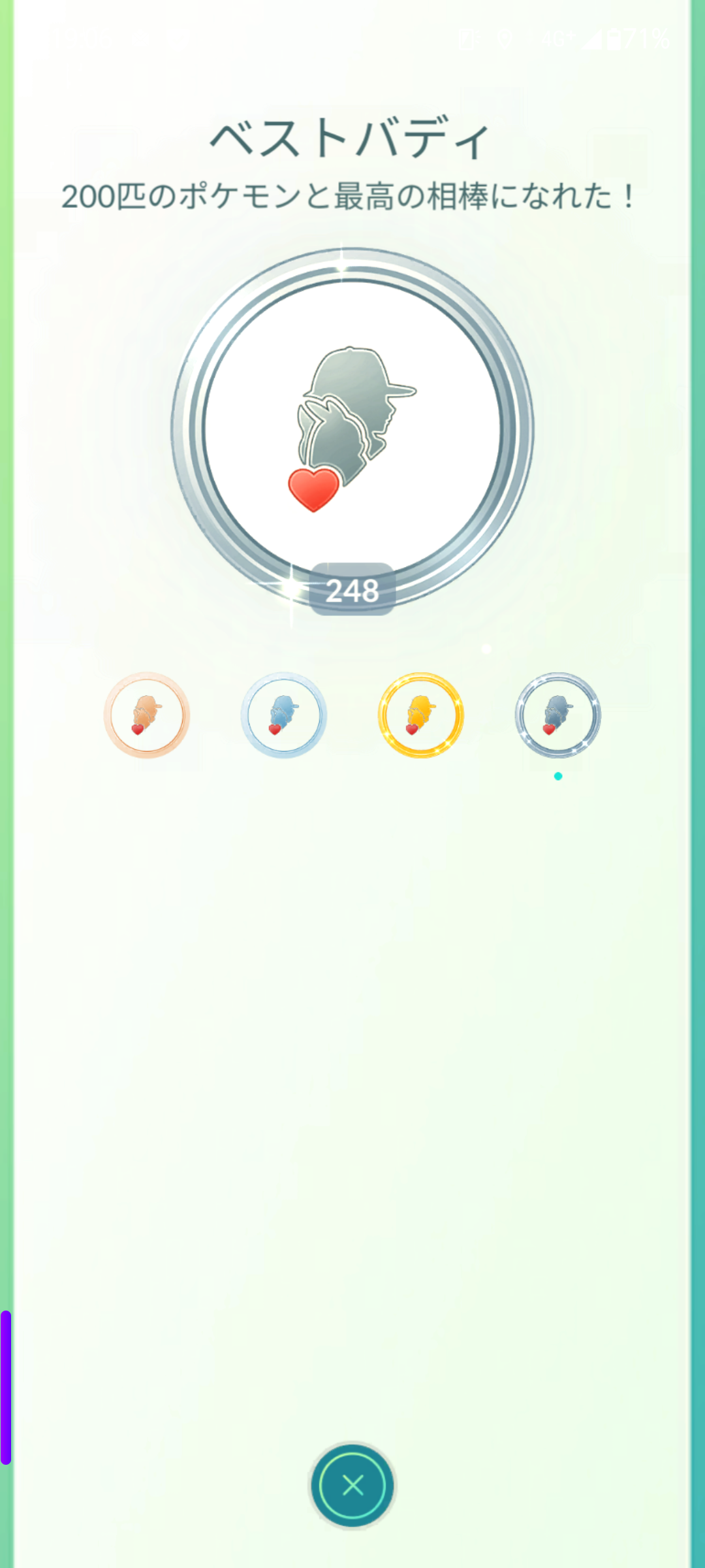 プラチナメダル60個。田舎者なので田舎優遇メダル持ってます。おひろめ149、最高の相棒248、大親友1485、ジム防衛時217,616。