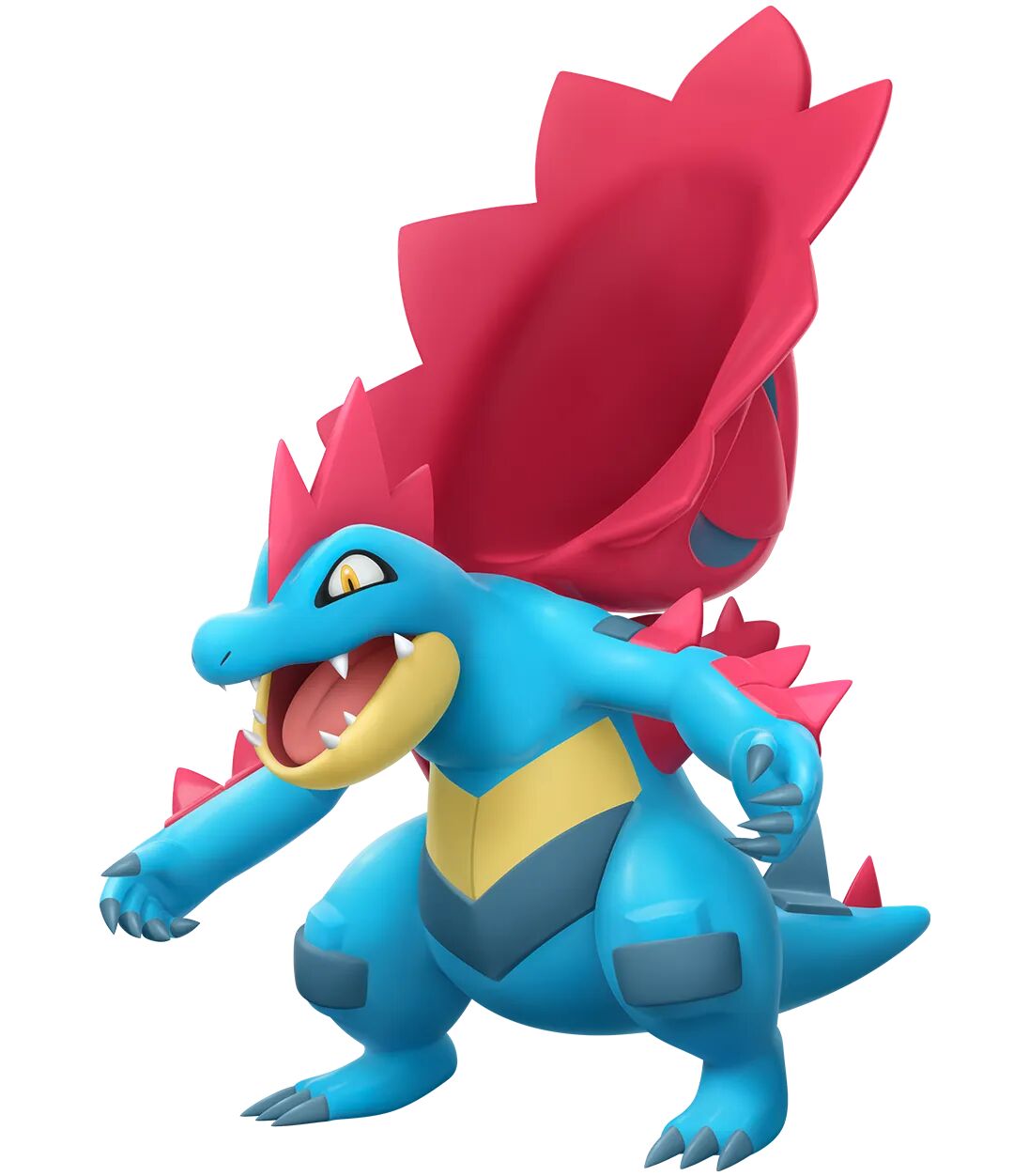 メガオーダイルは、メガシンカによって、みず・ドラゴンタイプとなりました。背びれの巨大化により、噛み砕く力が大きく向上しましたが、他にも機能が備わっていると考えられています。一つは防御面のパワーアップです。大きく硬いひれで頭を覆うことで、物理的な攻撃のダメージを軽減します。もう一つは放熱効果の向上です。メガオーダイルは背びれを使って放熱することで、メガシンカにより急上昇した体温を下げています。