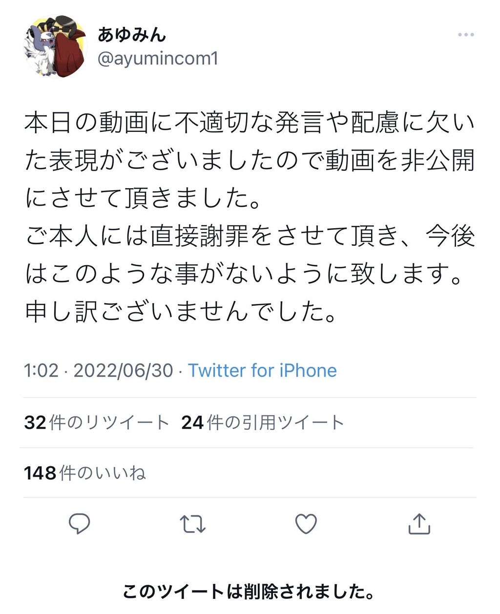 あゆみんは該当配信を削除、謝罪ツイートするけど謝罪ツイも即削除