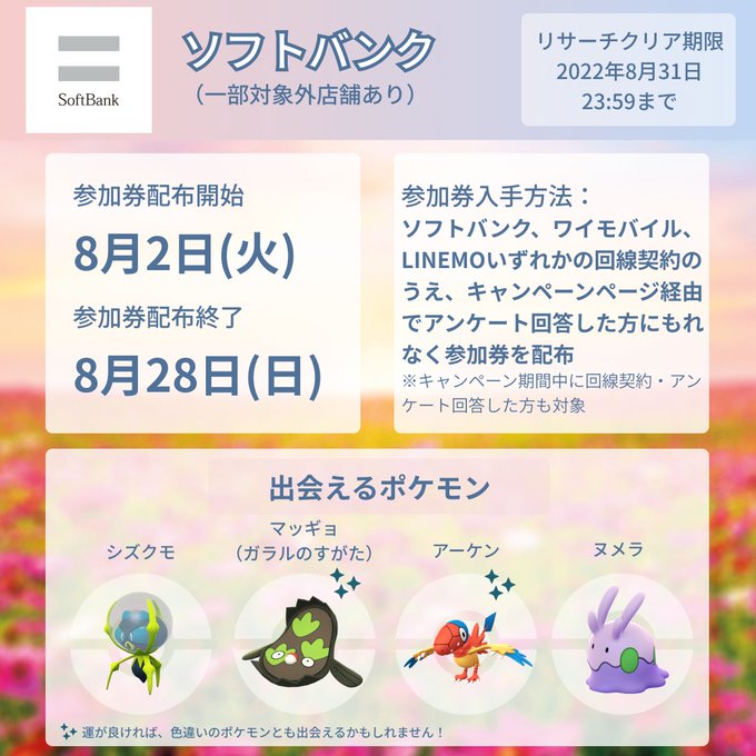 #ポケモンGO 「パートナーリサーチ」の参加券が「ソフトバンク」で獲得できます!参加券をゲットして、特別なタイムチャレンジに挑戦しよう。詳細はこちら(https://t.co/dFmEbQgwan) pic.twitter.com/xiIj6m0fVb