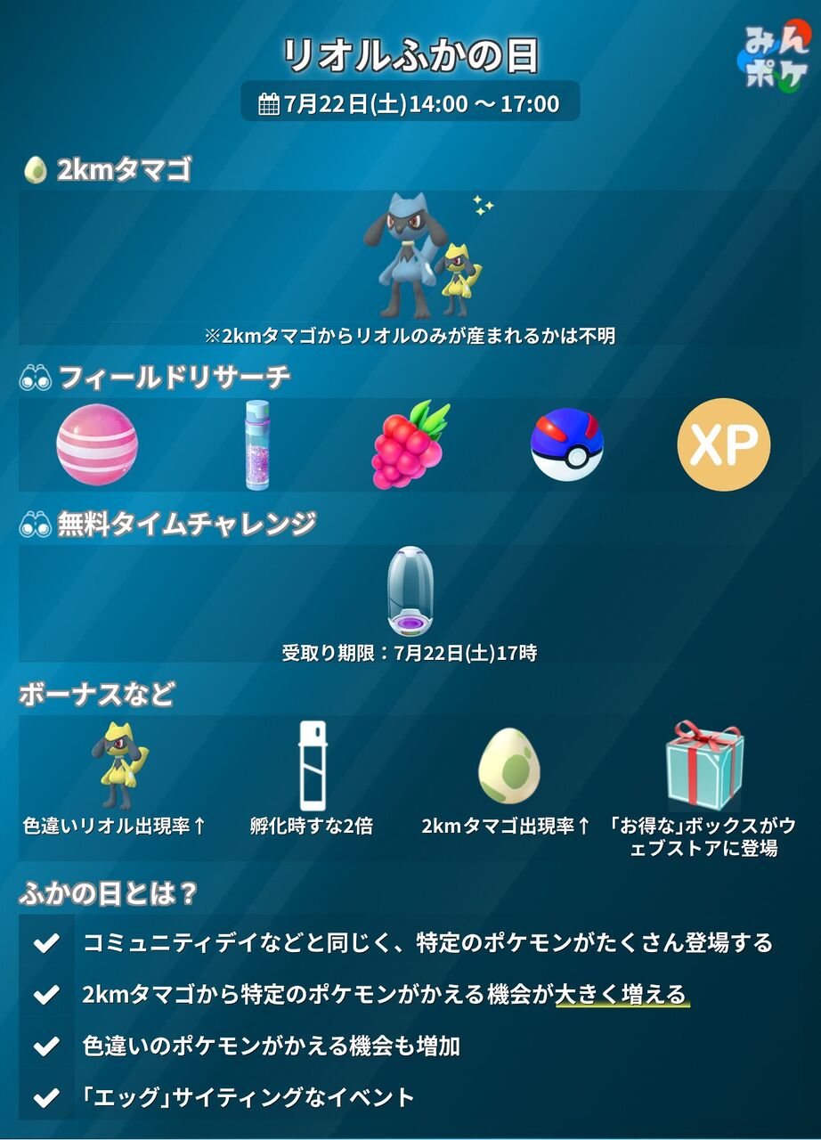 最初の「ふかの日」では、はもんポケモンの「リオル」が登場します。「ふかそうち」を準備して、3時間のイベント中にできるだけたくさんの「リオル」をタマゴからかえしましょう!