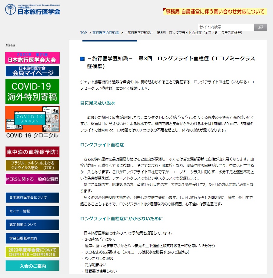 旅行医学のサイトにはロングフライト後2週間以内の心筋梗塞、心不全に注意といったものも見られるし